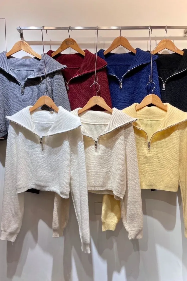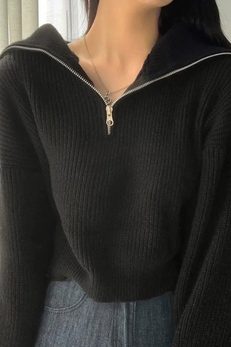 翻領半拉鍊短版坑紋針織上衣